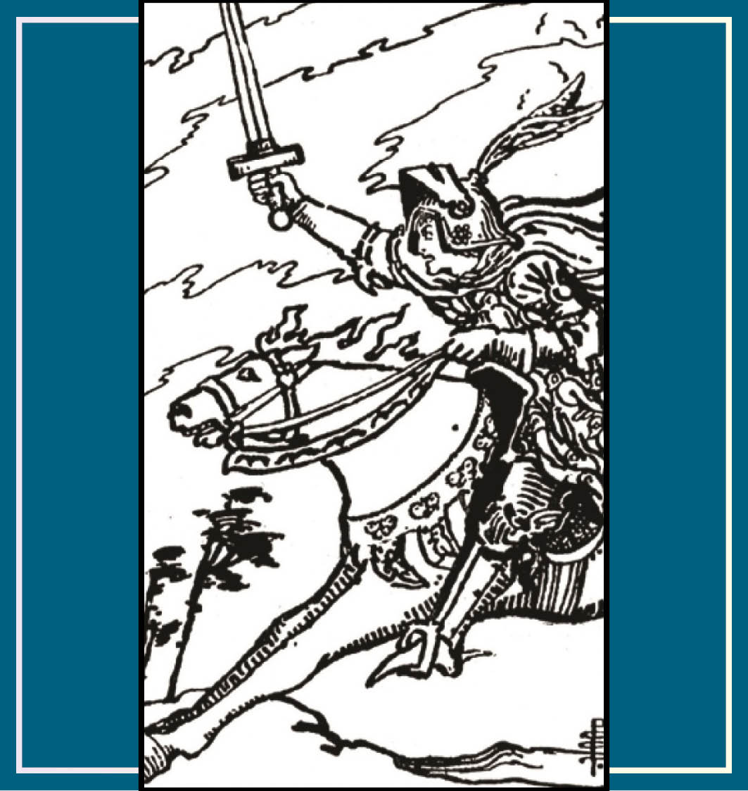 Wat pertinent niet werkt, is heel hard willen dat de wereld niet is zoals-ie is, maar zoals jij vindt dat-ie moet zijn. Dat is de combinatie van willen (vuur) en denken (lucht) waarmee de Ridder van Zwaarden hopeloos de mist in kan gaan. Er is ook veel goed aan deze kaart, trouwens, maar dit is wel een zwakte van deze vurige denker, deze uitgekiende doorzetter.