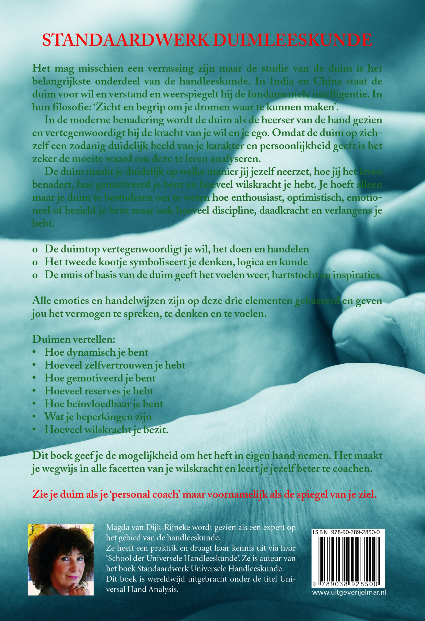 De duim maakt je duidelijk op welke manier jij jezelf neerzet, hoe jij het leven benadert, hoe gemotiveerd je bent en hoeveel wilskracht je hebt. Je hoeft alleen maar je duim te bestuderen om te weten hoe enthousiast, optimistisch, emotioneel of bezield je bent maar ook hoeveel discipline, daadkracht en verlangens je hebt.